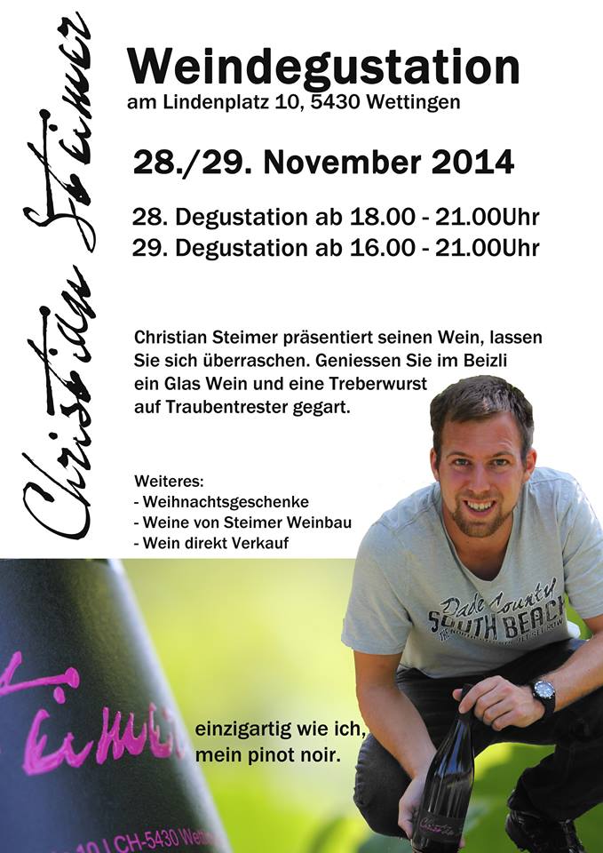 Am 28. und 29. November findet am Lindeplatz 10 d Degustation vom Christian Steimer sim Pinot Noir statt. Am Fritig cha me vom sächsi bis um nüni am Abig Wy trinke und Treberwurst ässe und am Samstig vom vieri bis um nüni. Au Wiehnachtsgschänk und Wy vo Steimer Wybau cha me dete kaufe.