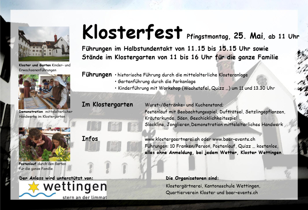 Scho sid einige Johr finded am Pfingstmentig s Chlosterfäst statt, so au jetzt am Mentig (25. Mai). Organisierd vo de Chlostergärtnerei, de Kanti, em Quartierverein Chloster, und vo baer-events.ch gitds en Postelauf durch de Garte, Führige für Chind und Erwachseni durchs Chloster und de Garte und es wird au zeiged, wie mittelalterlichs Handwerk funktionierd hed. S Fäst fangd um elfi aa und gohd bis um vieri. Führige werde zwüsche viertelabelfi und viertelabdrei alli halb Stund aabote. Au für d Verpflägig isch gsorged.