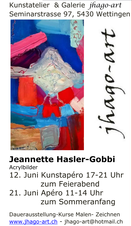 An de Seminarstroos 97, wo frühener de Beck Domeisen isch gsi, gids sit em letzte Augste e Kunstatelier mit Galerie. Im Juni finded dete zwei Apéros statt, zu dene d Inhaberin Jeannette Hasler-Gobi herzlich dued iilade (genai Ziite uf de Foti links).