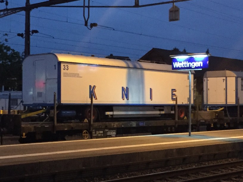 Nach numme zwei Täg isch de Circus Knie scho wieder am goh. Scho während de letzte Vorstellig, wo hüt um achti aagfange hed, sind scho die erste Circus-Wäge am Bahnhof Wettige verlade worde, damit morn z Basel alles cha parat gmachd werde.