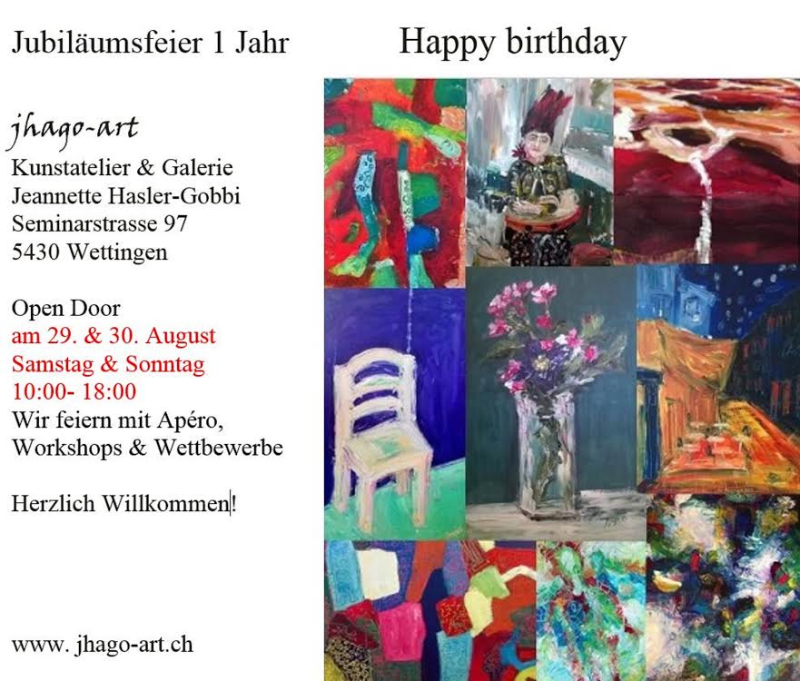 Am 29. und 30. Augschde fiered s Kunstatelier & d Galerie jhago-art a de Seminarstroose 97 s eijöhrig Jubiläum. Am Samstig und am Sunntig isch jewils vom zähni bis um sächsi offe, es gid en Apéro, Workshops und Wettbewerb.