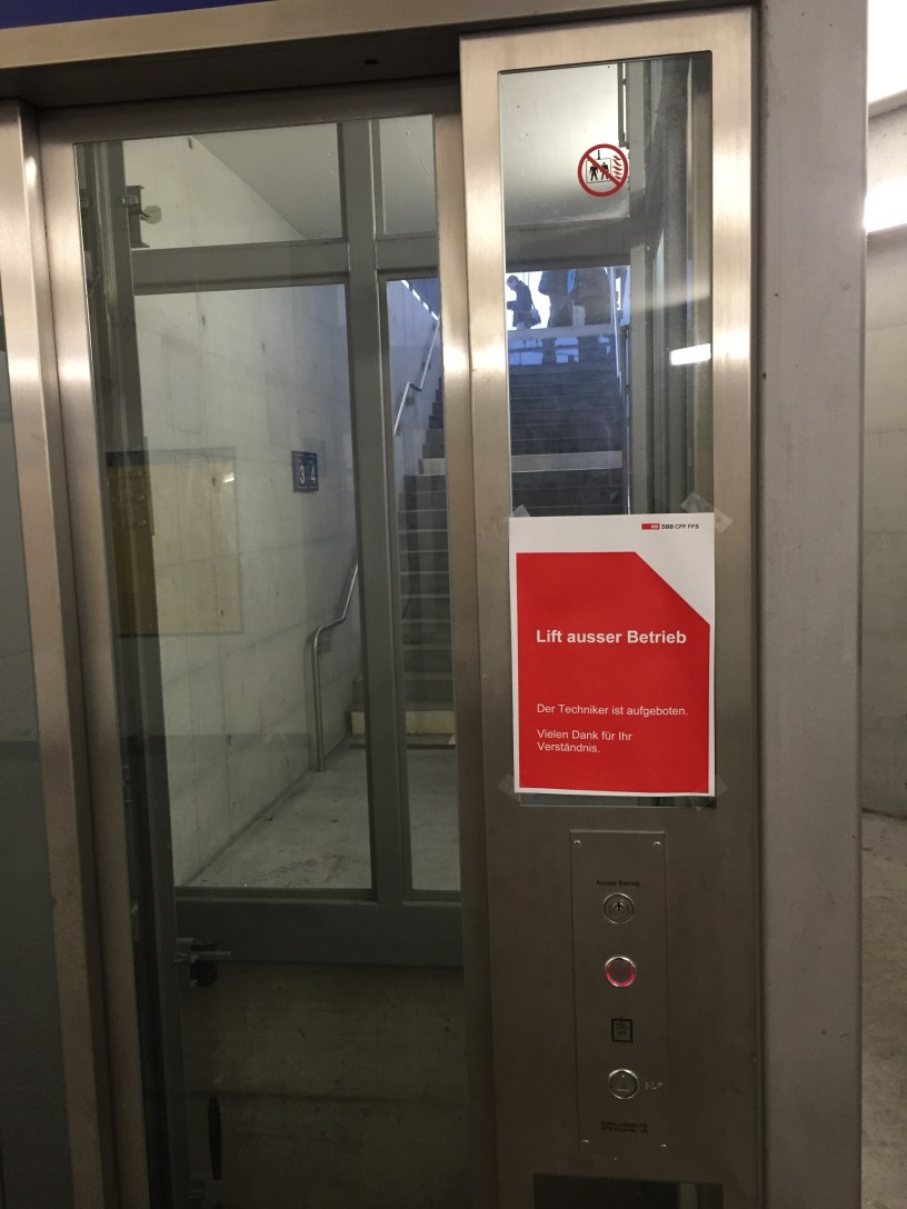 Am Bahnhof isch im Momänt de Lift zu Gleis 3/4 defekt