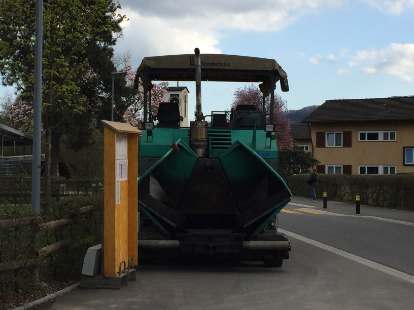 Nach de Saniirig vo de Werksleitige, hei d Bauarbeiter in de letzschte Ziit d Bsetzischtei für d Abgränzig vo de Trottoir iibaut und geschter, am 6. April sind d Trottoir hinter em Schuelhuus Alteburg asphaltiirt worde. Hüt isch dann di erschti Schicht vom Stroosebelag iibaut worde. In de Zwischeziit sind d Verbotsschild ewäg und d Auto hei hüt am Abe d Stroos chönne bruuche. Will no e zweiti Asphaltschicht uf de Stroos und de Trottoir muess iibaut werde, chunnts sicher no einisch zu erre Sperrig, aber dann hei d Fuesgänger, d Velo- und Autofahrer und alli andere Verchersteilnehmer wider freii Bahn. D Fahrbahn isch aber, wi es au bi de andre Noibauprojäkt im Quartiir de Fall isch, schmäler wi vorher und für d Fuessgänger hets dütlich meh Platz, was d 30er-Zone für de Langsamverkehr sicherer macht.