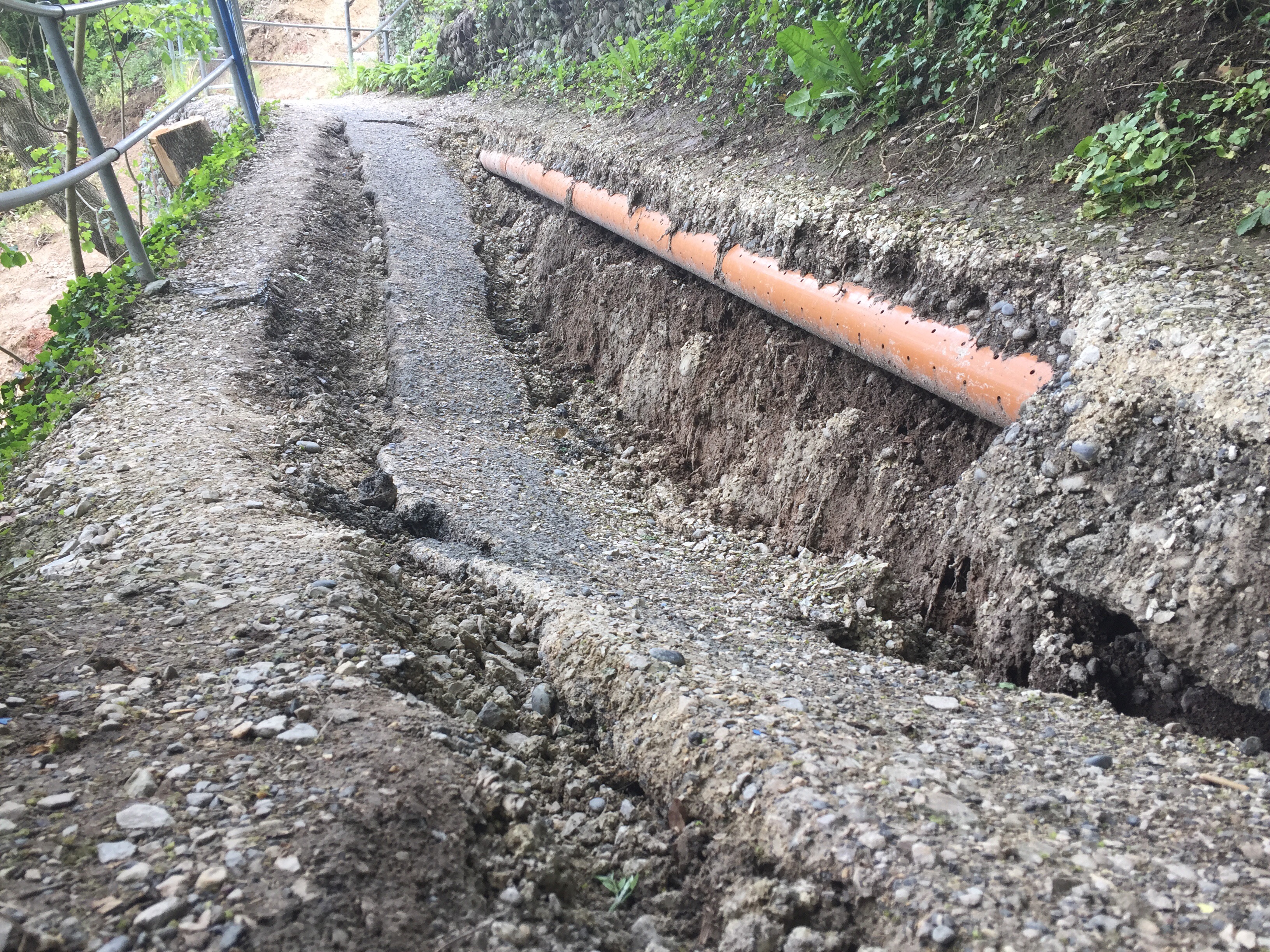 De Wäg zur Webermühli het sich an einer Stell öppe en halbe Meter abgsenkt, wi mir scho brichted hend. Wil unterhalb vom Wäg Grabigsarbeite für de Schräglift stattgfunde hend, stellt sich natürlich d Frog, wer zum Schluss d Verantwortig trait und für de Schade, wo entstande isch, hafted. Ufgrumd vom Pfingschtwochenend hend mir weder bi de Baufirma noch bi de Gmeind chönne aafroge. Dütlich isch aber, dass de Hang unterhalb vom Wäg au in Bewegig isch.