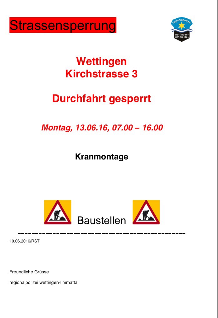 Uncategorized Am Mäntig isch d Kirchstroos gschperrt Date: June 12, 2016Author: Wettiger Nochrichte 0 Comments A de Kirchstroos 3 wird noi baued und das het morn Folge für de Vercher. Wil de Krane gschtelld wird, isch d Durchfahrt vom sibni am Morge bis um viiri am Abe gschperrt. Share this: Click to share on X (Opens in new window) X Click to share on Facebook (Opens in new window) Facebook Like Loading...