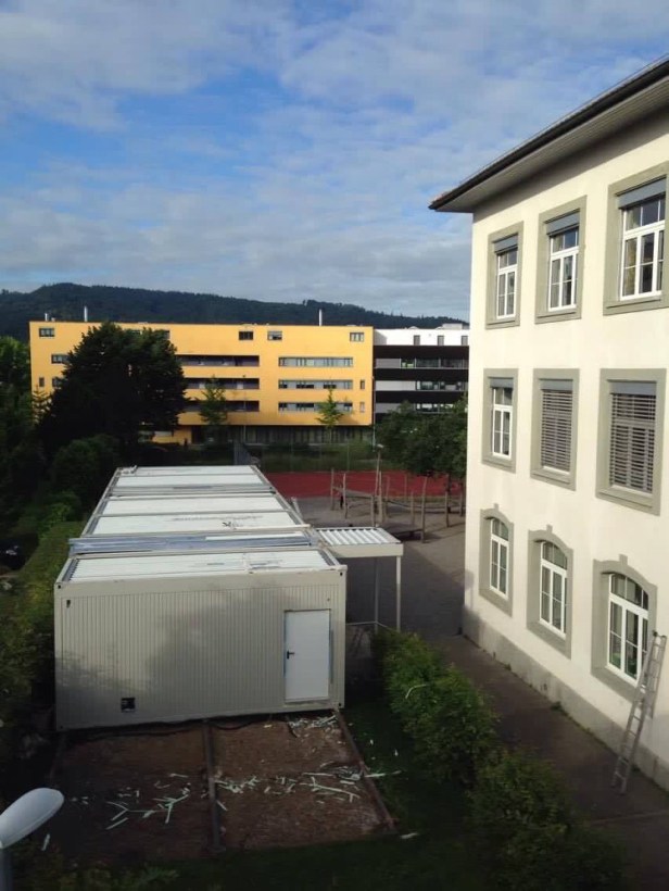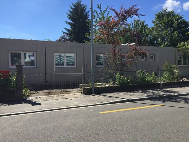 Di erschte Container sind scho ewägBi de Schuelhüüser im Dorf sind bis hüt am Morge Container gschtande, wo jetzt zu eme Kindergarte werde. Dazu sind si an de noi Iisatzort transportiirt worde und zwar an d Bahnhofstroos. Dete, wo de letscht vo de «zwölf Apostel» gstande isch, sind si ufgstellt worde und werde nach de Sommerferie für en Chindsgi bruuchd. D Nöchi zum Chindsgi Rosenau macht d gmeinsami Nutzig vom Spilplatz dete möglich.