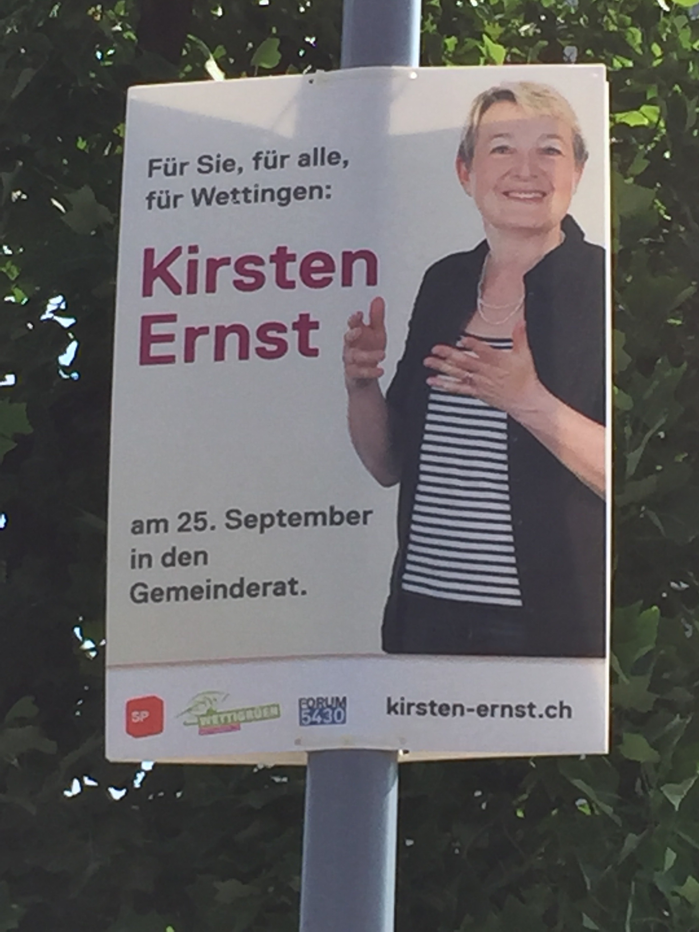 Vo de Kirsten Ernst, Gmeindrotskandidatin vo de SP, sind sit aafangs Woche Plakat z gseh. Unterstützt wird si au vo de WettiGrüene und em Forum5430. D Plakat für de vo de SVP nominiirte Gägekandidat Franz-Beat Schwere fehled noch im Stroosebild vo Wettige, es dörft aber numme e Frog vo de Ziit si, bis au er a de Stroose optisch präsent wird. Au er het Unterstützig von ere andere Partei, de FDP.