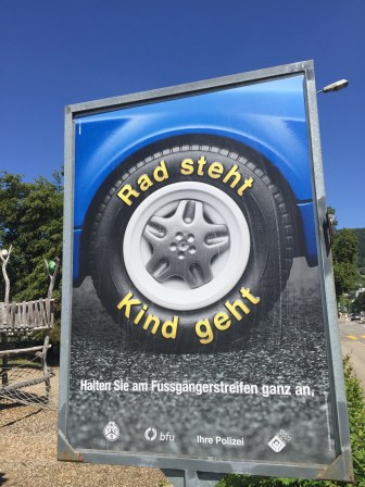 Insbesondere für d Automobilischte heisst das, dass si mit vilne Chind müesse rächne, wo mit em Vercher no nöd so vertraut sind. Wichtig zwüsse isch au, dass d Chind glehrt überchömmed, erscht über d Stroos z goh, wenn es Auto ganz stoht. Langsam uf en Fuessgängerstreife zuezfahren und mit Winke de Chind z zeige, so sötte über d Stroos goh, isch also nöd eso guet. Lieber normal annefahre und dann würkli ganz aahalte!