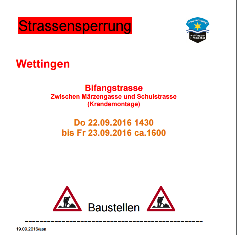 A de Bifangschtroos wird vo Donnschtig, 22. September um halbidrü bis am Fritig, 23. September 2016 bis öppe um viiri am Namittag en Kran demontiirt. Us dem Grund wird d Schtroos zwüsche de Märzegass und de Schuelstroos in dere Ziit gschperrt. D Zuefahrt für d Aastösser isch gwährleischtet und au d Fuessgänger chönnd d Schtroos bruuche.