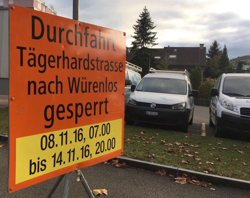 Wege de Bauarbeite an de Busspur isch de Vercher zwüsche de Furttalchrüzig und Wettige vonere Umleitig betroffe. Wer uf de Landstroos Richtig Würelos wot, muess d Umleitig übers Tägi in Kauf neh. Was aber, wenn d Tägerhardstroos in de erschte Hälfti vom November für viir Tag gschperrt isch?