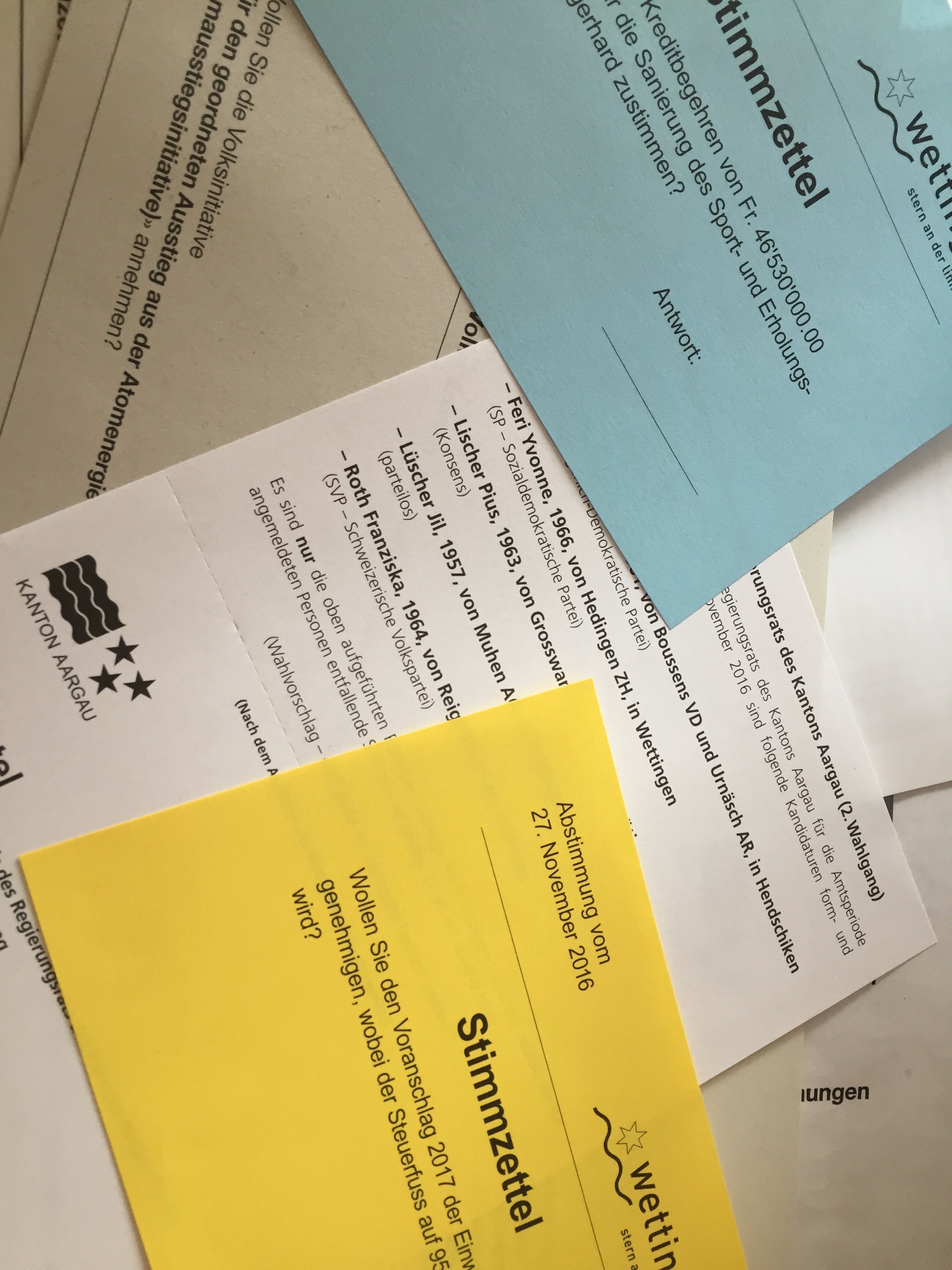 Au di beide kommunale Vorlage sind wichtig. Zum eine gohts ums Budget 2017, wo de Iiwohnerrat dütlich aagnoh het, aber vo de SP, de EVP und de WettiGrüene abglehnt worden isch. Zum zweite stoht d Abstimmig über de Kredit zur Saniirig vom Tägi aa. Dete gohts um en Investition in Höchi vo Fr. 46’530’000.00, damit s Hallebad, d Iisaalag und di andere Gebäudeteil chönnt wider in Stand gstellt werde, so dass s Tägi wider zumene Ushängeschild vo Wettige wird.