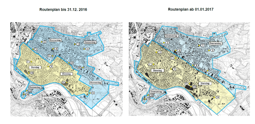 Noi ghöred alli Gebiet südlich vo de Landstroos zu de Tsischtigsentsorgig mit Usnahm vo de Schwimmbadstroos, em Gottesgrabewäg und de Chloschterhalbinsle. S Entsorgigsgebiet vom Donnschtig umfassd noi s Gebiet nördlich vo de Landstroos , d Schwimmbadstroos, de Gottesgrabewäg und d Chloschterhalbinsle. D Gmeind het uf ihre Homepage d en Plan veröffentliched (lueg obe) und e genaui Lischte vo de betroffene Ligeschafte.