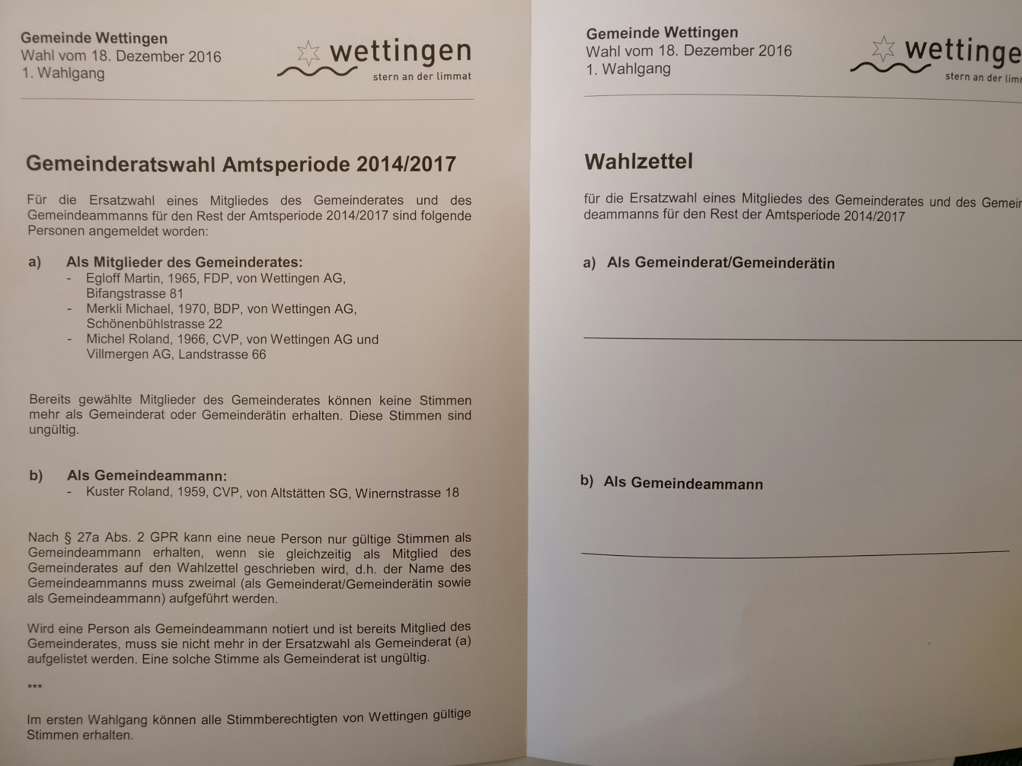 Für de Markus Dieth müend d Wettigerinne und Wettiger en noie Gmeindamma und en noie Gmeindrat wähle. Während bi de Ersatzwahl zum Amma alles klar z si schint, wil numme de Roland Kuster v de CVP kandidiirt, gits für d Ersatzwahl drü Kandidate. De Roland Michel (CVP), de Martin Egloff (FDP) und de Michael Merkli (BDP).
