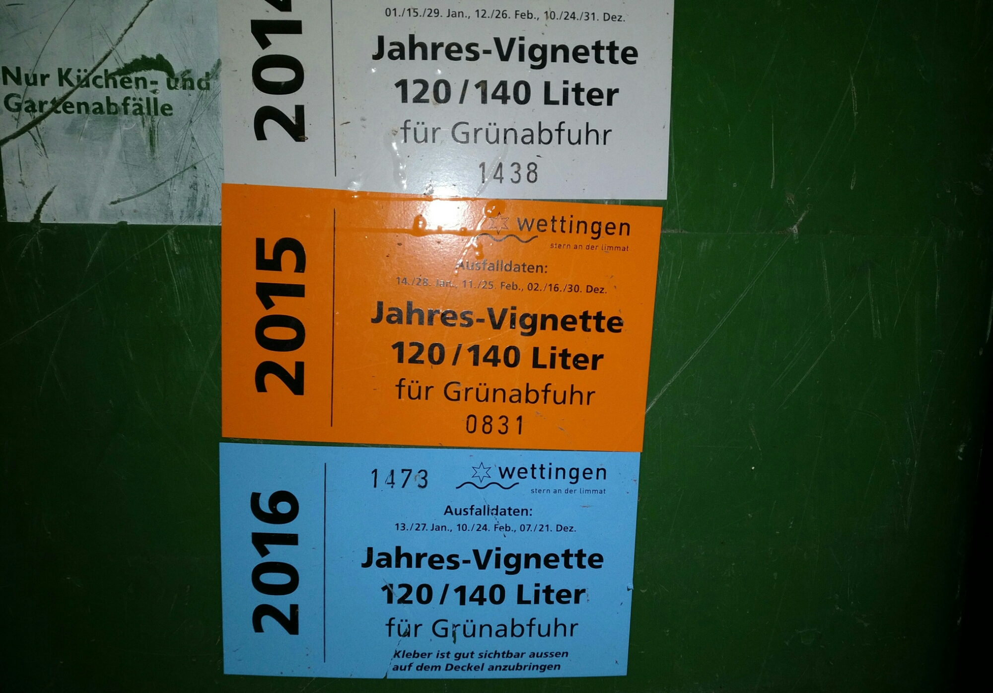 Jedes Jahr bruuchts für d Grüenabfuhr e noii Vignette. Je nach grössi vo de Container unterscheided sich d Priise, wo me für es Jahr muess zahle. Ab em 1. Februar 2017 muess di noi Vignette guet sichtbar aabrochd si.