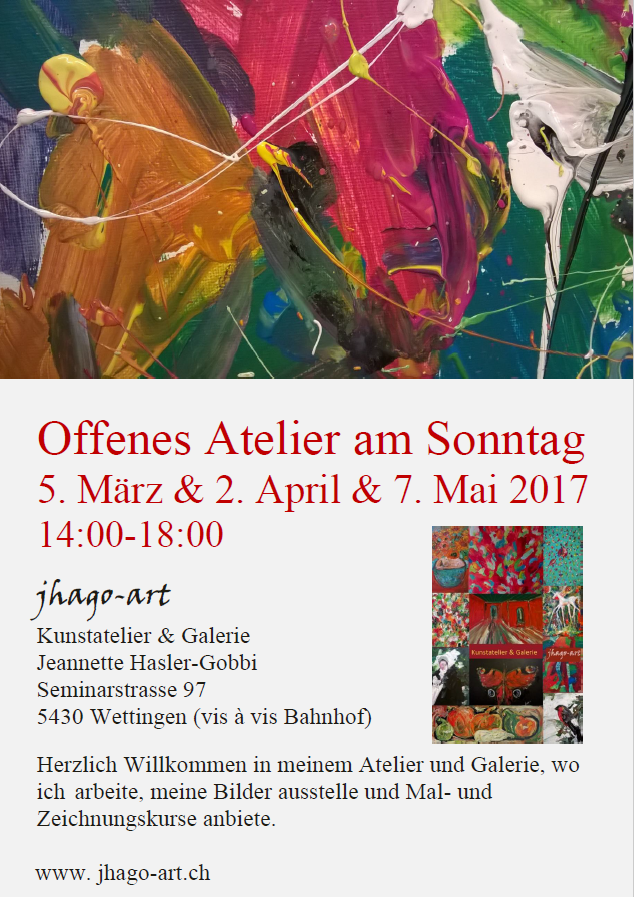 Am nöchschte Sunntig, de 5. März 2017, werd d Jeannette Hasler-Gobbi ihres Atelier met Galerie jhago-art am Nomitag vom zwoi bis am sechsi uftue. So chönnt au die Enteressierte, wo unter de Wuche kei Glägeheit findet, bi ihre im Atelier verbiluägä, wo si schaffed, ihri Bilder usstellet und Körs gibt. Au am 2. April und em 7. Mai händ er nomol e Möglichkeit. D Könschtlerin freu sech öber eure Bsuech.