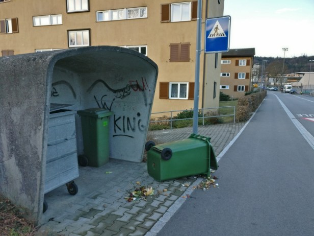 Wer hüt, Sunntig, 5. März 2017 am Morge uf de Winkelriedstrass Richtig Spitzbueb gloffe esch, hät es gseh: Mehreri Grüenguetcontainer, wo umgschtosse worde sind. De Inhalt, wo naturgmäss weder förs Aug, no för d Nase e Freud esch, hät uf em Trottoir gläge.