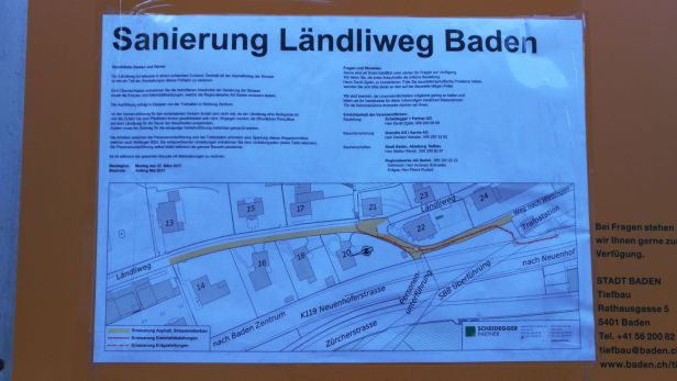 Vom 3. bis öppe 28. April 2017 wird z Bade de Ländliwäg gsperrt. Das het au Uswürkige z Wettige.