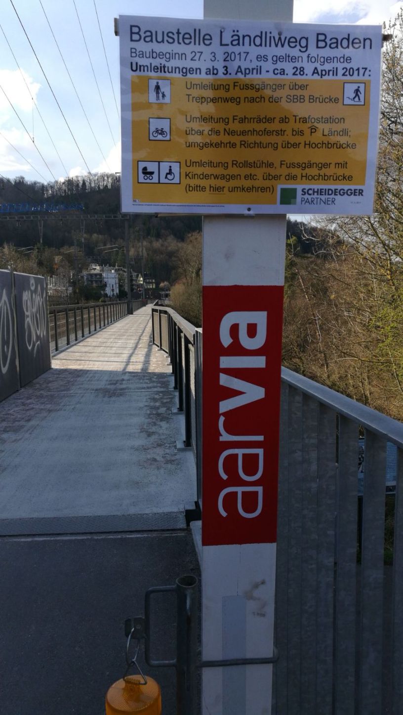 Sit de Fertigstellig vom Fuess- und Velowäg über d Isebahnbrugg uf Bade, wird de Wäg gärn und oft bruuchd. Für Velo esch er di schnellscht und sicherscht Verbindig uf Bade. Für einigi Woche müend sich jetzt sowohl Fuessgänger wi Velofahrer en andere Wäg uf Bade sueche. D Stadt empfiehlt ineme Ushang für Velo de Wäg über Noiehof oder d Hochbrugg, für Lüt mit Chinderwäge und Rollstüehl über d Hochbrugg und für Fuesgänger es Uswiche über de Fueswäg entlang vom Kulturwäg Limmat Richitg Bade.