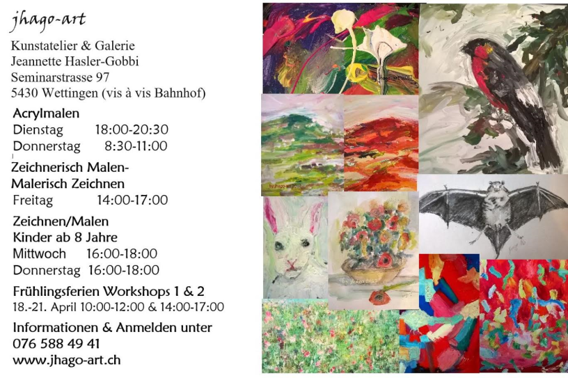 Enfos und Anmeldig em Kunstatelier & Galerie jhago-art Jeannette Hasler-Gobbi, Seminarstrasse 97 (vis-à-vis Bahnhof) www.jhago-art.ch