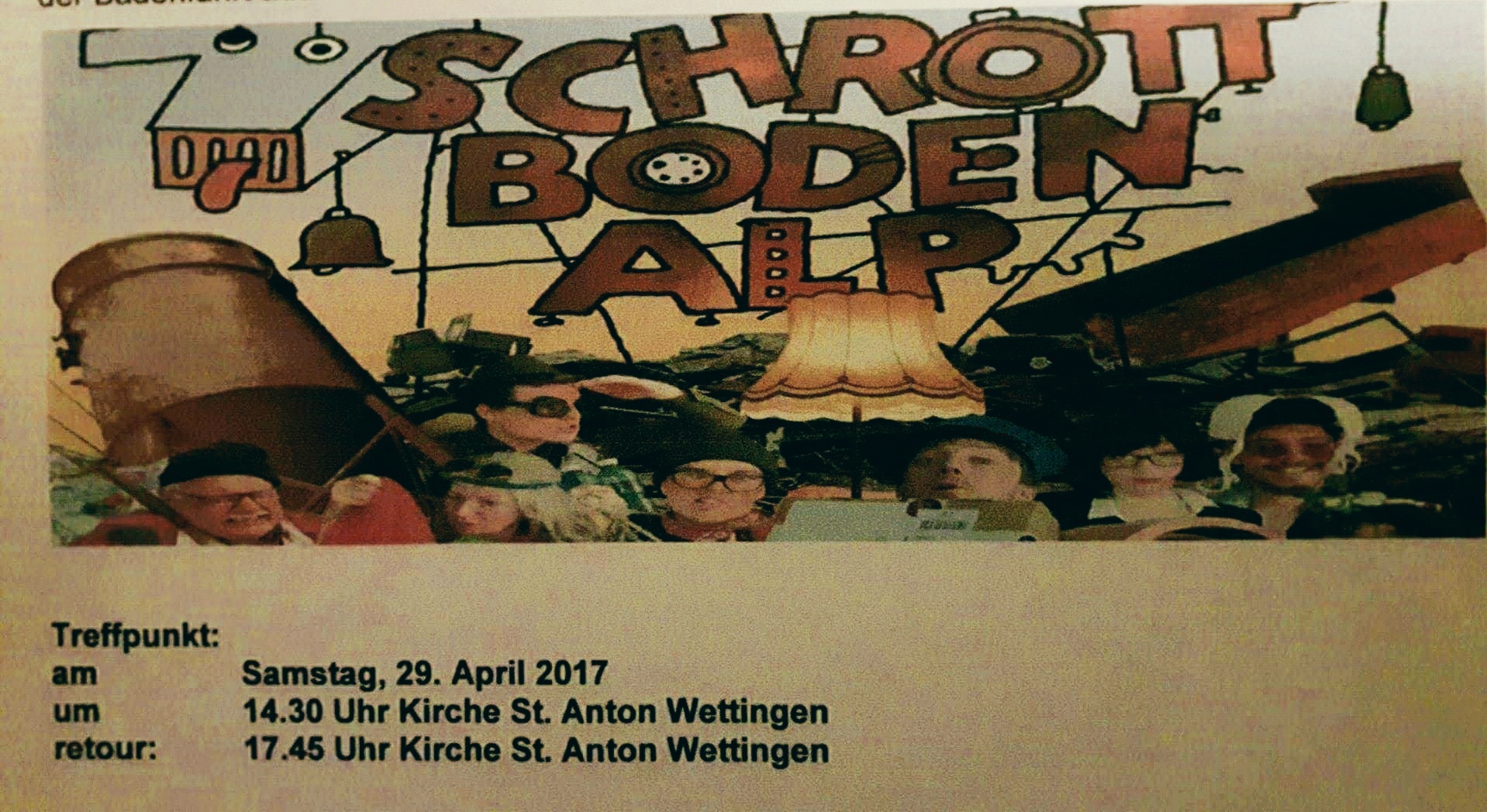 Am Samstig, 29.4.17 am 14.30 träffed mer euis bin de kath. Chile St. Anton, bildet Fahrgemeinschafte und fahred zu de Theaterprob uf Künte. Mer lueged, ghöre wie s’Programm entstaht, tusched euis us mit de Schauspieler und erfahred scho chli öppis vo de “Schrottbodenalp”.