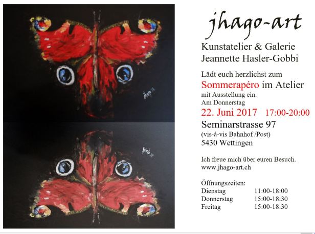 Zu dem Anlass sind er ganz härzlich welkomme zum Summerapéro am Donnschtig de 22. Juni 2017 vom foifi bis achti am Obig om Kunschtatelier Galerie jhago-art vo de Könschtlerin Jeannette Hasler-Gobbi a de Seminarschtroos 97 vis-à-vis vom Bahnhof Wettige. D Könschtlerin freut sech öber eure Bsuech.