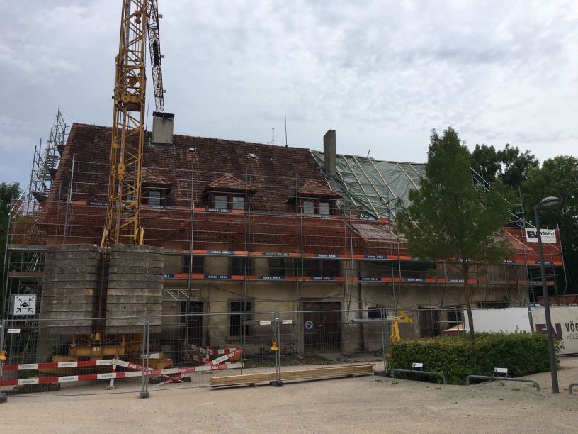 Im November 2015, wo mir mit em Kantonsbaumeischter François Chappuis im Kontakt sind gsi, het er gsait, dass es noch e paar Johr würd goh, bis über s Huus a de Chloschterstross 20 öppis entschiide wird. Jetzt schin aber scho innerhalb vo nöd emol zwei Johr öppis z gah. S Huus isch iigrüschted, en Krane isch gstellt und s Dach vom ehemolige Stall isch abdeckt.