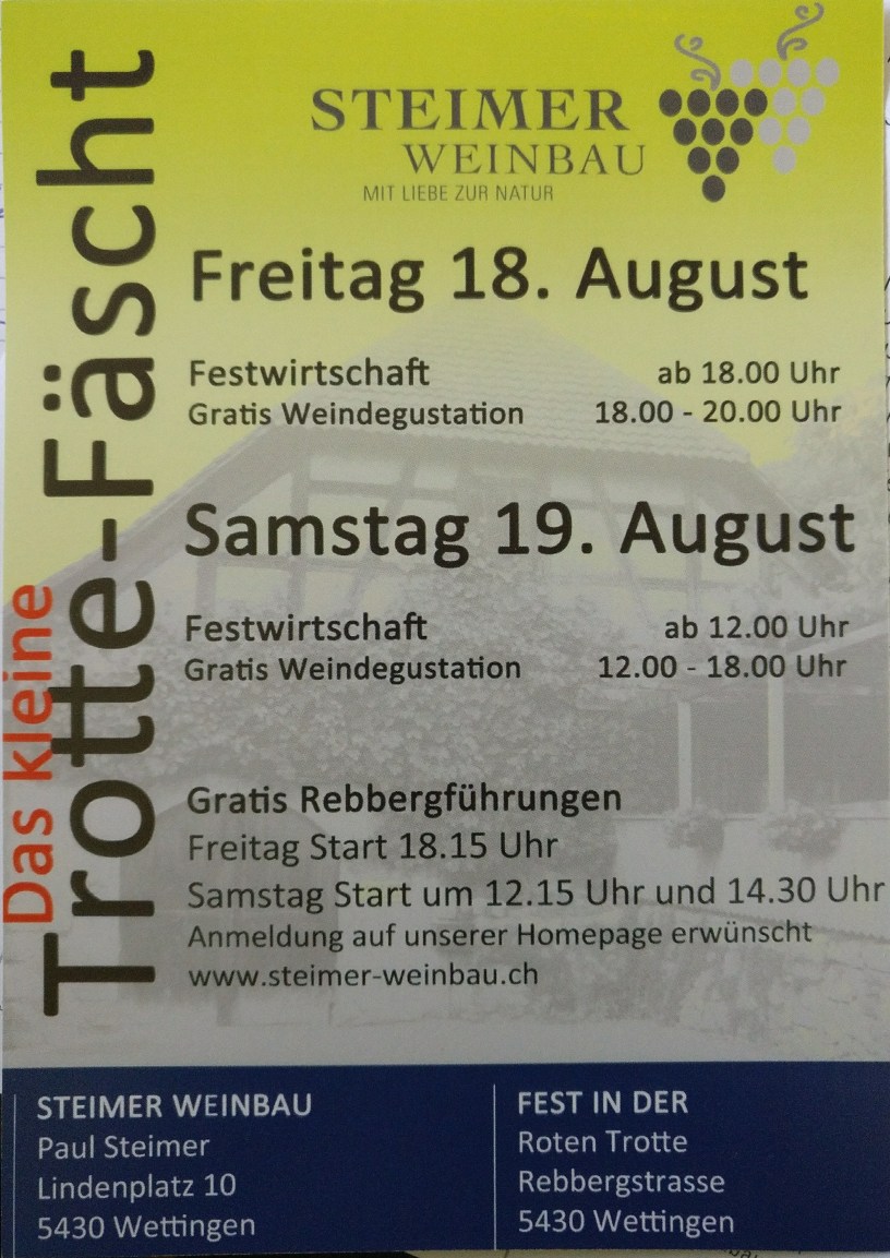 Scho zum 25. Mol lad Steimer Weinbau zum alljährliche Trotte-Fäscht ii. Es started hüt, Fritig, 18. August 2017 ab de Sächsi. Bis um Achti am Abig cha me Wy deguschtiire, Fäschtwirtschaft Lauf natürli länger. Am Samschtig started s Trotte-Fäscht um Zwölfi am Mittag. D Wydeguschtation goht bis um Sächsi.