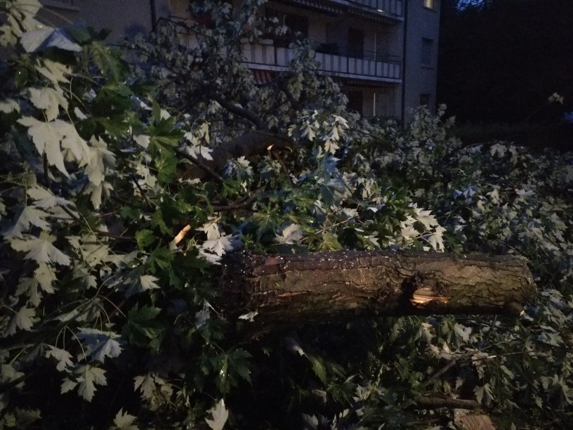 Wo es überall Schäde geht het, wüssed mir nöd, aber i de Eigerstrass isch en grosse Baum usenand broche. Zum Glück het er numme de Wäg zum Huus blockiird. D Aawohner, d Fassade und d Auto direkt daneben sind nöd troffe worde.
