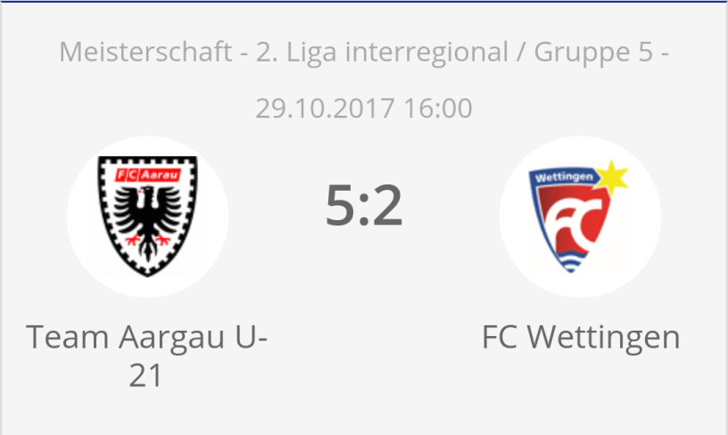 S Team vom FC het hüt, Sunntig, 29. Oktober 2017 z Aarau gege d U21 Aargau müesse aaträte. Nach zuletscht erfolgriche Match, het es hüt e 5:2-Niederlag geh. S erfreuliche dra isch, dass de FC Wettige witerhin uf em 4. Platz vo de Gruppe 5 vo de 2. Liga interregional stoht.